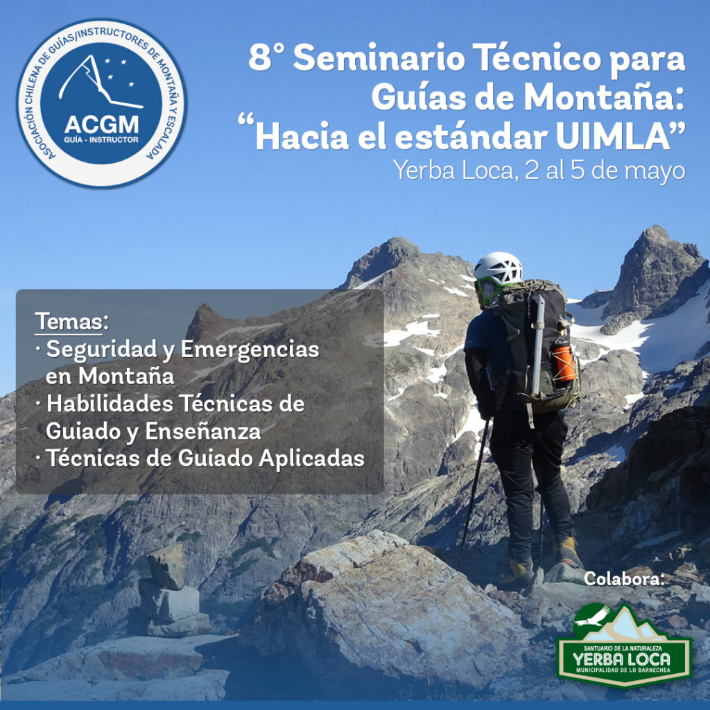 La Asociación Chilena de Guías/Instructores de Montaña y Escalada ACGM, invita a todos sus asociados a participar en el 8º Seminario Técnico y Asamblea General Anual 2019: «Hacia el estándar UIMLA». La actividad se realizará desde el día jueves 2 hasta el domingo 5 de mayo de 2019, en el sector de Yerba Loca, Lo Barnechea, Región Metropolitana.
